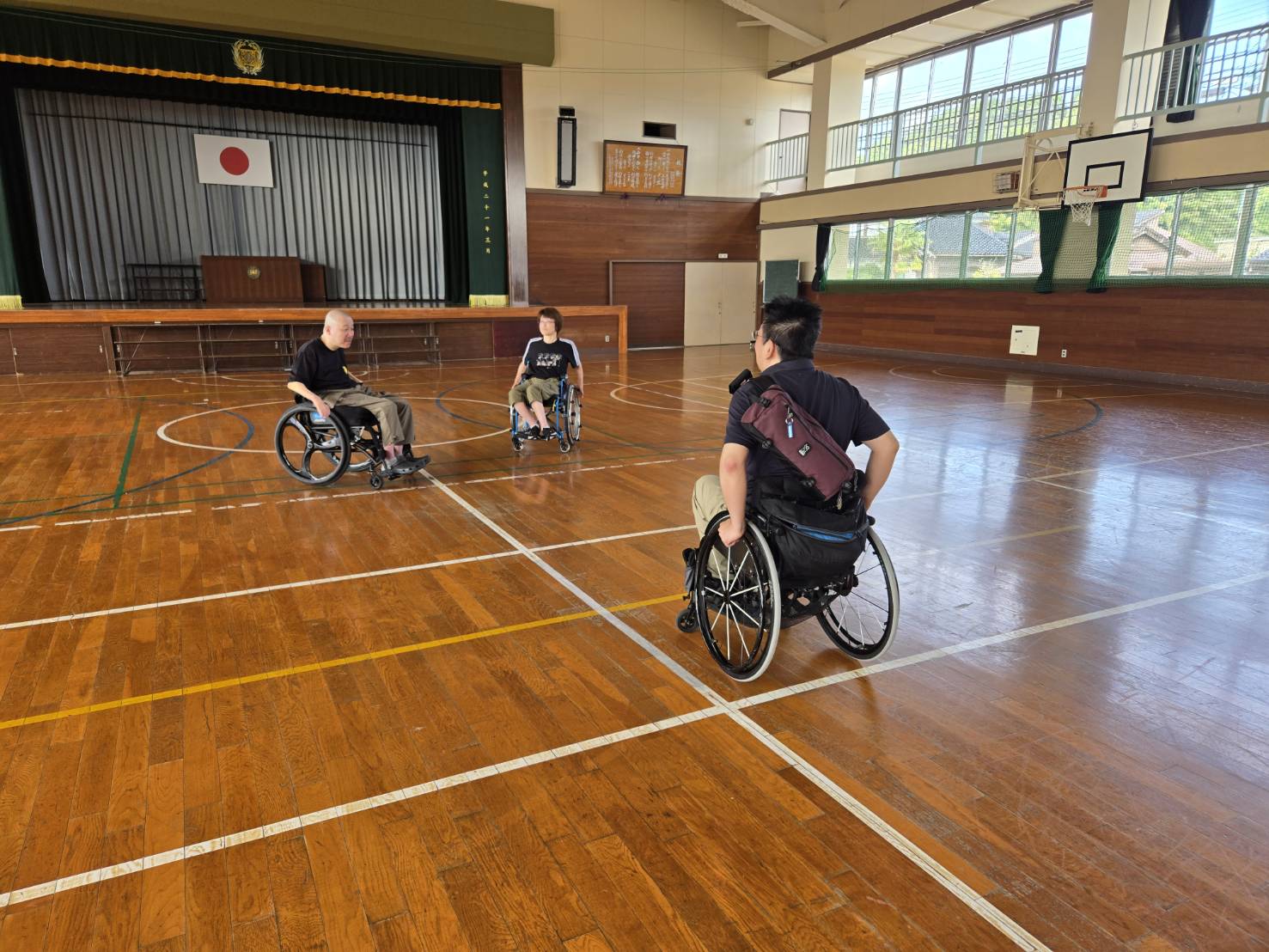 だいぶ涼しくなりましたねー。今日の午前中は石堤公民館体育館で、車いすツインバスケの練習がありました。
