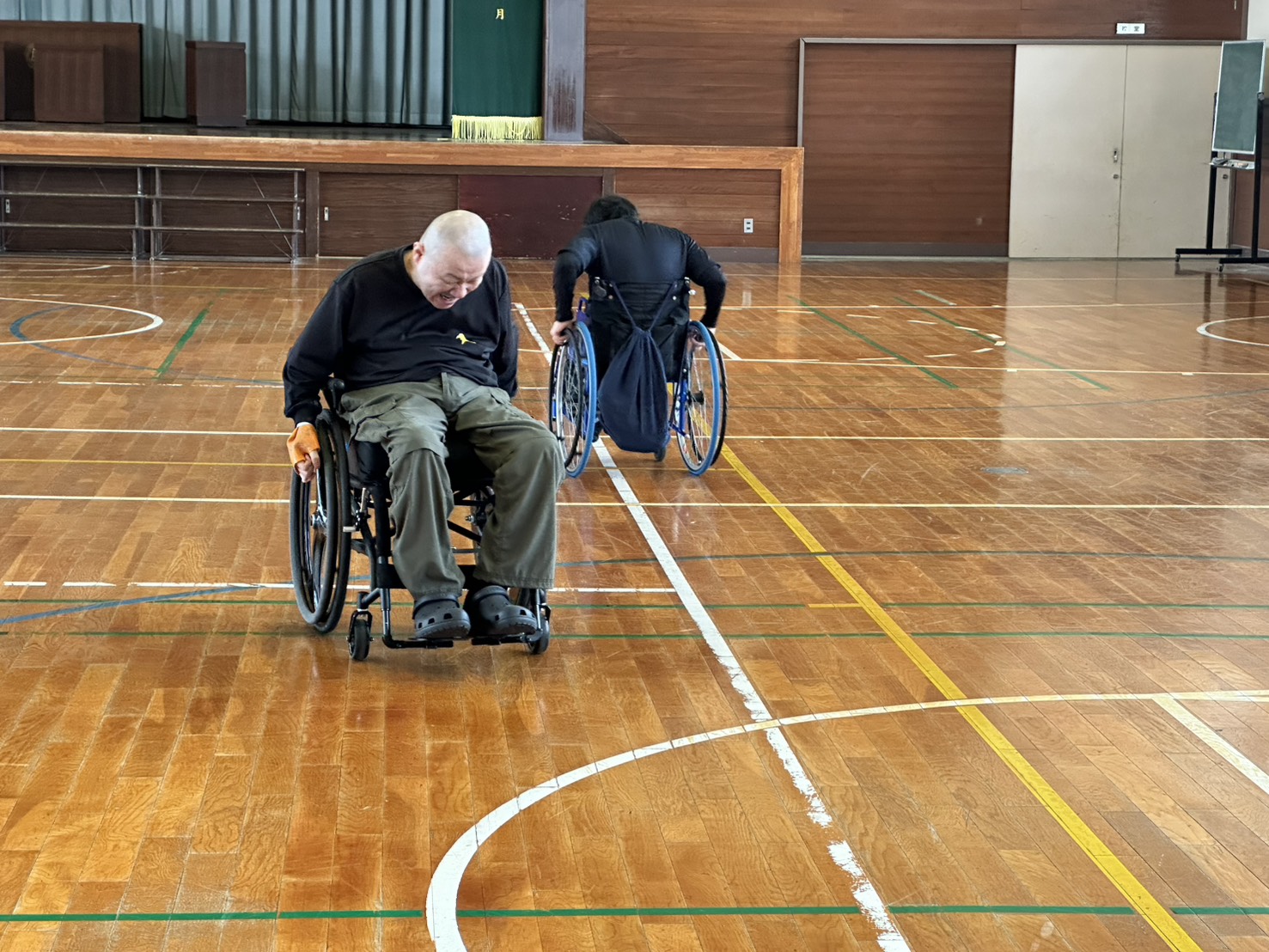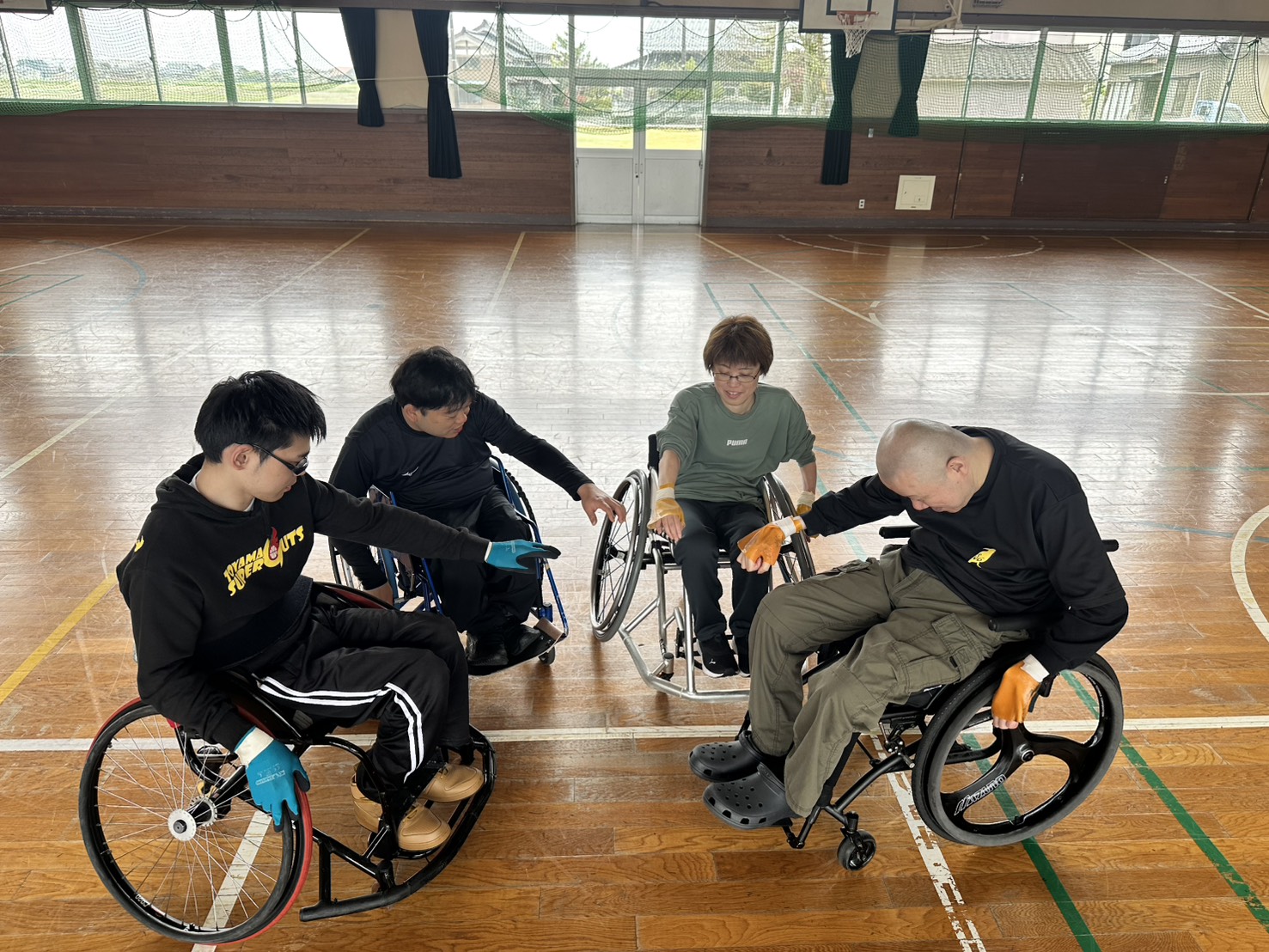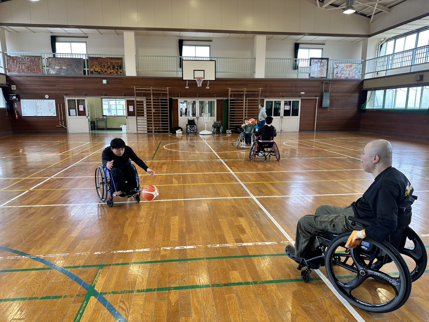 だいぶ暖かくなりましたねー。今日の午前中は石堤公民館体育館で、車いすツインバスケの練習がありました。